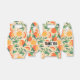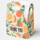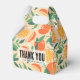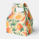 Una minúscula caja de favores con un ambiente retro. Un patrón compuesto de naranjas en rodajas, naranjas enteros, hojas verdes y flores blancas.