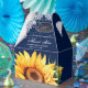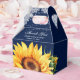 Pon tus regalos de matrimonio/ducha en estas románticas cajas de flores de color azul marino con un girasol en un fondo de burrega adornadas con encaje floral blanco y luces de cuerdas.
