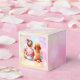 Baby Shower Favorece. Bonito acuarela arte que muestra a una niña pequeña con un arco rosado sentada al lado de su Apricot Poodle rodeada de flores. It's a Girl! Rosa y morado.