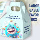 Primer o cualquier niño cumpleaños, fiesta de piscina, grandes cajas de favores gables con el tiburón feliz. Puede elegir entre 3 tamaños de estas cajas de preferencia gable. Personaliza fácilmente el texto. - Kate Eden Art.