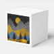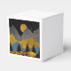 Resumen de diseño de paisajes montañosos en audaces tonos dorados, negros y azules con un amanecer y pájaros.