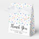 Esta divertida caja de favores de la fiesta de cumpleaños muestra un patrón de puntos de confeti de arco iris dibujado a mano junto con "¡Gracias por celebrar con nosotros!", tipografía y texto personalizado. ¡Sólo personaliza el nombre y hazlo suyo!