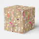 Una cascada de notas musicales en rosa fucsia, coral, rojo melocotón, negro y crema sobre una caja de favores de la fiesta de fondo color marrón claro