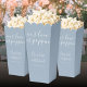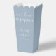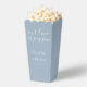Caja elegante de palomitas de maíz para boda con nombres en letra script y fecha especial en tipografía moderna sobre fondo azul polvoriento. Diseñado por Thisisnotme