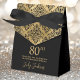 Esta elegante caja de agradecimiento de damasco dorado por el 80 cumpleaños con falso foil dorado brillante, el nombre de la cumpleañera en una fuente de letra de moda, y atada con un elegante lazo negro sería perfecta para su evento. Sería genial para una estación de dulces, en una mesa de regalos de agradecimiento o en cada lugar con un favor. Asegúrese de pedir suficientes para todos sus invitados.