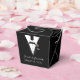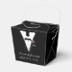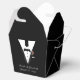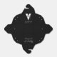 El diseño de esmoquin presenta la apariencia de un esmoquin como fondo para su información, incluyendo nombres de la pareja, fecha de la boda y un mensaje especial de agradecimiento en la parte posterior. Todo en una fuente decorativa.