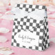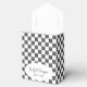 These personalized boxes are perfect for wedding and party favors. The boxes have an all over checkerboard pattern of white and black painted squares. Your names and wedding date appear on the front of the box in a white oval shaped frame.