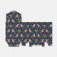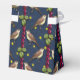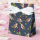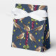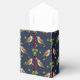 El encantador patrón en esta caja de favores con cinta comenzó con una ilustración original de ZoeSPEAK de pequeños pájaros cantores. Las aves están una frente a la otra, como si estuvieran cantando, contra un fondo azul marino profundo salpicado de pequeñas estrellas amarillas. Hay filas verticales de cintas rojas retorcidas, con grupos de hojas verdes entre los pequeños pájaros marrones.