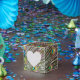 Obra de arte original de un pavo real con su plumaje en exhibición. Las plumas de cola iridiscente brillan en tonos azules, verde azulados, verdes y morados, dándole a este orgulloso pájaro la apariencia de la realeza. Los colores vivos de esta majestuosa ave de arveja brillan en este arte que llena todo el espacio de diseño.