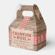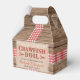Este diseño rústico presenta un fondo de madera con cinta roja y blanca. Encima de esto hay una textura de burlap con un serif rojo y negro y un tipo de letra manuscrita que es todo personalizable a tu evento, ya sea un hervidero de cangrejo, langosta, marisco o hierba de pescado. Celebra tu compromiso, cumpleaños, graduación o cualquier evento de estilo con este diseño de caja de favores!