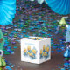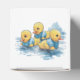Pato de caucho amarillo acuarela vestido de azul en un charco de agua. ¡Genial para la guardería infantil!