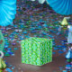 Modalidades geométricas de fondo Art Déco en tonos turquesa, azul y verde pálido sobre un fondo verde de jade profundo