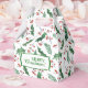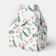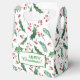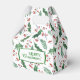 Aquí hay una caja de favores de bonito para la temporada de Navidades que presenta un colorido patrón de hojas y bayas rojas. El diseño predominantemente verde y rojo se sitúa sobre un fondo blanco. Un lado de la caja tiene una pancarta verde bordeada que dice "Feliz Navidad". Si lo prefiere, puede dejar en blanco los campos de texto antes de realizar el pedido y utilizar el cartel en blanco para escribir en un nombre. ¡Depende de ti!