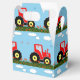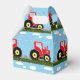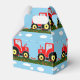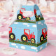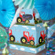 Patrón de baldosas tractor de juguete sobre un fondo azul claro, con nubes y hierba. Diseño gráfico ideal para decoración de guardería o regalos para niños pequeños.