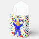 Un lindo payaso de circo haciendo malabares sentado en una caja de favores blancos de un punto polka de colores brillantes. Ideal para los niños fiestas, no olvides personalizar el texto con tus detalles.