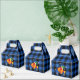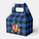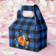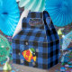 Ilustracion de un pez naranja tropical amarillo navidad bajo el océano con burbujas en un fondo de patrón búfalo de cuadros negros azules. Esta caja con un bonito diseño personalizado es un regalo para los amantes de la navidad, la pesca y el buceo.