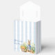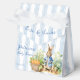 Peter rabbit baby shower favors, Peter rabbit with a blue jacket blue in vegetable garden baby shower personalized favor boxes. A cute bunny in a blue jacket standing in a garden with carrots for a baby boy baby shower monogrammed favor box, vintage retro story book baby shower personalized favors, retro dusty blue stripes baby shower monogrammed favor box