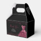 A beautiful plum purple themed elegant watercolor dress gown on a black background with faux glitter at the top and bottom of the favor box.