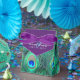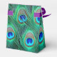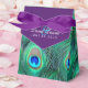 Elegante plum morado y vibrante esmeralda verde, azul real y azul verde azulado plumas de plumas de pavo real caja de favores. Puede añadir texto en el estilo de letra, tamaño y color de su elección en esta hermosa caja de favores de la boda púrpura de ciruela.