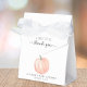 Cuidada caja de favores de ducha de bebé neutra de género con "gracias" en una simple tipografía gris y un guión elegante con toques, y una acuarela de calabaza naranja.