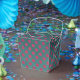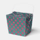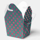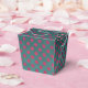 Una caja de favores verde azulada y borgoñona con acentos de rosa y morado.
