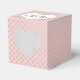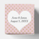 Corazón blanco con nombres de recién casados sobre rosa rubor y patrón de puntos dorados con brillo.