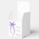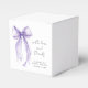 Chic bridal shower thank you party favor boxes featuring an elegant purple coquette bow watercolor, "with love and thanks" showcased in a stylish script, and the name of the bride and shower date in simple modern lettering.