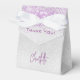 Un cumpleaños o evento importante elegante y glamuroso. Fondo con apariencia plateada falsa con purpuradas falsas y destellos. Con el texto: ¡Gracias! Personaliza y añade tu nombre. El nombre está escrito con una fuente de letra manuscrita de moda.