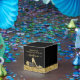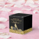 Elegante caja de favores de fiesta cuadrada personalizada con zapatos de tacón altos de purpurina dorado y un purpurina de imitación dorado amarillo con salpicaduras de confeti en un fondo negro con texto de agradecimiento personalizado, perfecto para un cumpleaños moderno y de moda, mitzvah de murciélago, Quinceañera, ducha de novia, ducha de bebé o fiesta de soltera. UTILICE EL EDITOR DE PLANTILLAS DE DISEÑO para cambiar los tipos de letra, los colores y el diseño para crear una divertida y única caja de favores personalizada para los invitados fiestas.