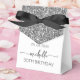 Elegante Girly Moderno estilo Purpurina Plata Nombre Monograma Firma Script Personalizado Personalizado 30 (o cualquier edad) cumpleaños Favor Box. Este diseño presenta su primer nombre en una tipografía (o caligrafía) de tipo de letra cruz con estilo escrito a mano sobre un falso bloque purpurina de color gris plateado sobre fondo blanco. Estas elegantes cajas de regalo femeninas son ideales para repartir, regalos, regalos, regalos de invitados y dulces durante una fiesta de cumpleaños, recepción de bodas, ducha de bebé, fiesta de soltera, barbacoa, ducha de novia, dulce cumpleaños 16, aniversario y más.