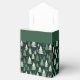 Una sofisticada bolsa de productos de temporada para los colmenares que empaquetan pequeños artículos como el bálsamo de labio de invierno y gotas de miel envueltas o latas de caramelo. Bosque de invierno con copos de nieve sobre un fondo verde forestal. Agregue su nombre comercial y de producto, o su mensaje de vacaciones y nombre de familia.