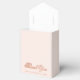 Una caja de regalo rosa para una boda con colores de boda rosa y dorado rosado. En la solapa, tiene un escudo de oro rosa con una silueta de perfil de dama de la Regencia en él.
