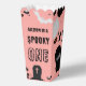 Bolsa de favores con temática de Halloween con un fantasma, gato negro, araña, murciélago, caramelos, velas, araña y calabazas para un primer cumpleaños. "¡Espeluznante bolsa de cumpleaños!""PERSONALIZA fácilmente este diseño con tu información", dice el texto. Si busca ARTÍCULOS DE COINCIDENCIA, busque nuestra selección o tienda de correspondencia.