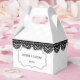 Crea tu propio paquete personalizado para favores de boda. Esta caja de favores está lista para ser personalizada con sus nombres y fecha de boda dentro de un marco ornamentado. El fondo blanco tiene un diseño de tela falsa y se acentúa con mi ilustracion de encaje negro.
