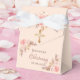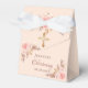 Un fondo dorado rosa. Decorado con flores de oro rosa y rosa, pasto de pampas y cruz dorada. Con el texto: Christening escrito con un estilo de escritura moderno de color rosa oscuro con letras a mano. Personalice y agregue un nombre y una fecha.
