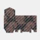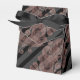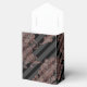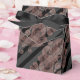 Elegante caja de favor que presenta patrones de damasco rosa dorado y rayas negras.