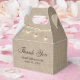 Caja de agradecimiento de boda rústico con luces de cadena en un fondo de burlap.