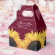 Caja de favores de boda rústica y personalizado con un fondo de madera borgoña con girasoles. Personalice fácilmente esta caja de favores florales de Borgoña con los detalles de su evento.