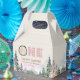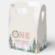 Esta caja de cambio está decorada con montañas acuáticas y un paisaje forestal. la "una" es un círculo de madera y un guijarro rosa. Es la forma perfecta de agradecer a los clientes la visita al fiesta de su pequeña.