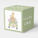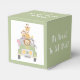 Cute baby ducha, caja de favores con una acuarela de ilustracion de bebés (león, cebra, elefante, jirafa y mono) apilados en un vehículo de safari y "Muchas gracias", "Está a punto de volverse salvaje" y el nombre de la madre en un guion blanco y verde jungla.