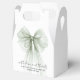 Elegant bridal shower party favor gift boxes featuring a sage green coquette bow watercolor, "with love and thanks" showcased in a chic modern script, and the name of the bride and the shower date in simple lettering.