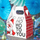 El personaje gráfico lindo de Santa Claus aparece desde lejos a la izquierda y la tipografía es "HO HO HO TO YOU", todo en la parte delantera. Alrededor de la caja hay un patrón noruego clásico de tejido creado digitalmente en rojo y blanco.