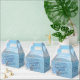 Caja de Favor de Boda de Destino de Grecia con edificios de iglesia de cúpula azul y blanca de Santorini Oia y costa del Mar Mediterráneo Ageo con un diseño personalizado retro vintage de sello de pasaporte de boda con nombres, fecha de boda y texto personalizado de ubicación.