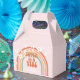 Siete inspirado en el retro es una caja de favores de la fiesta de cumpleaños Vibe 7º con arcoiris estilo hippie, daisies y fuentes boho y colores.