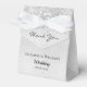 Un elegante fondo falso plateado decorado con confeti. Con el texto: Boda y Gracias escrito con una escritura moderna a mano con letras. Personalice y agregue sus nombres y la fecha.