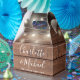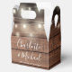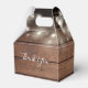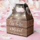 Caja de favores de boda rústica con luces de cadena de bonito, nombres de script de firma de moda y fecha especial en un fondo de paneles de madera. Puedes personalizar con tu propio mensaje de agradecimiento al revés. ¡Una forma perfecta de agradecerles a sus huéspedes! Diseñado por Thisisnotme©