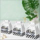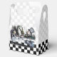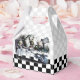 Caja de favores de estilo gable con una imagen vintage de Alicia en el país de las maravillas, en la parte delantera y trasera, del fiesta de té de Mad Hatter con Alicia, la liebre de Marzo y Dormouse sobre un fondo de tablero de ajedrez gris y blanco y negro y blanco. Ver confeti coincidente, bolso de favores, bolsos de regalo, etiqueta de regalo, pegatina rectangular y papel de envoltura. Vea toda la colección de la caja de favores de Wonderland en los TOUCHES ESPECIALES | Sección de favoritos de partido.
