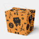 ¡Una caja del favor del truco o de la invitación de Halloween para esos caramelos y chocolates! Tiene muchos elementos de Halloween que incluyan siluetas de los gatos, palos, árboles, piedras sepulcrales, búhos, árboles marchitados, las calabazas y misterioso tallada Jack-o-linterna mirando posiblemente casas encantadas. El texto lee truco o la invitación. Una paleta de color del negro y del naranja con los pedazos del blanco.