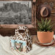 "Un niño pequeño está en camino" y sabemos que estás tan emocionado! Celebra que mamá (o sus padres) estén al estilo rústico occidental de broma de vaca con este niño diseño "Baby Shower". Cuenta con una base de arena acuática con numerosos cactus, herradura, botas y gorra de vaquero, junto con un rústico cartel de madera que anuncia el "Baby Shower" contra una gran herradura marrón oscura en la parte delantera y trasera con un áspero fondo de piel de vaca marrón. Diseño compuesto por Holiday Hearts Designs.