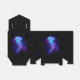 Gran medusa azul, de dibujo artístico, brillante y brillante, con largos tentáculos sobre fondo negro con bioluminiscencia violeta. Luminosas medusas.